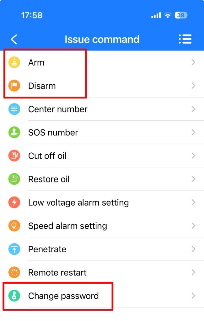 ④Issue commandでアラームのON/OFF設定とログインパスワードの変更をします。他の項目は他の機種で使用するコマンドなのでいじらないようにしてください。コマンド操作は発信機がオンラインの時(エンジンがかかっているとき)だけ有効です。